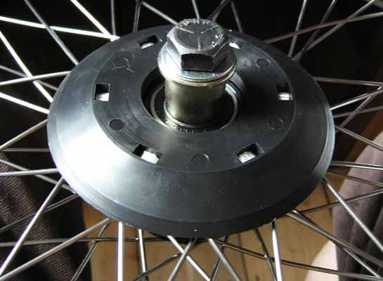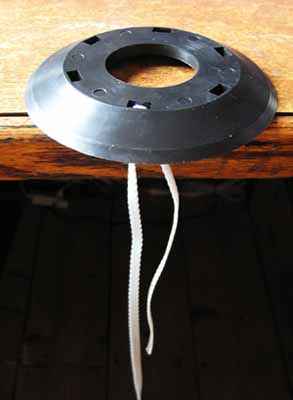 Step 3. Feed both the free ends of the strap through the first of these gaps between spokes and feed the longer end over to the nearer of the next pair of mounting holes. Try not to twist the strap. Pull it tight down through the new hole. Take note here that the edge of the gland is touching the spokes before any tension is added to the strap, this is how it should be. |