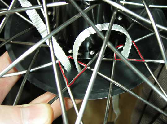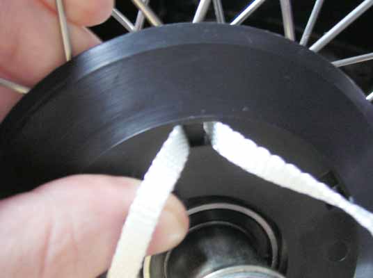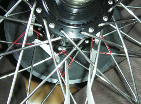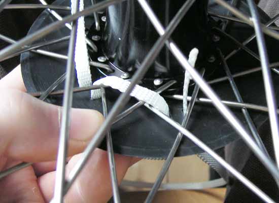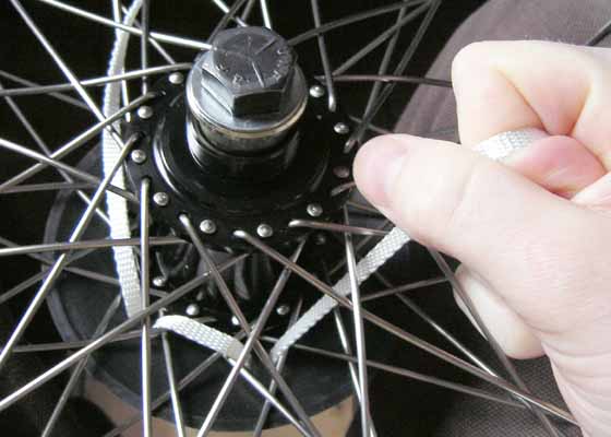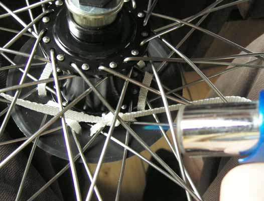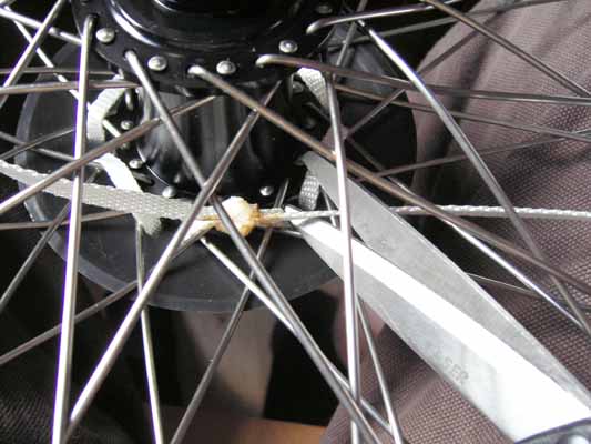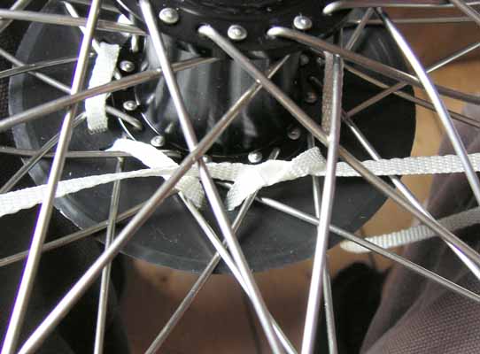 Step 8. When you reach the other end of the strap (back at the start). Take your time to make sure the GLAND is nie and firmly fixed to the wheel. If it seems a bit slack and you can wiggle it a lot, then work round from the start and feed the slack through hoel by hole. Pass both free ends up through the spokes and tie a simple knot. This is the first stage of a reef knot. |