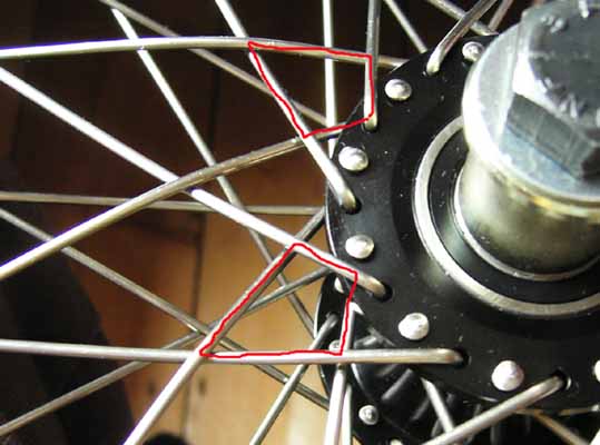 Step 9. Feed the free ends out through other spoke holes so you can get a good grip on them from an appropriate angle and pull the knot very tight. |