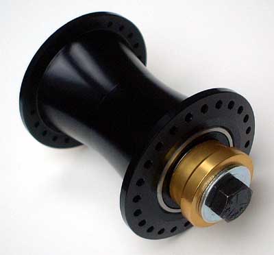 this was achieved by developing a new aluminium axle. The MONKEY uses the standard HOMER shell and bearings so if necessary it can always be turned into a HOMER by fitting the axle and collars. This picture shows the Monkey axle (on the left) and its gold anodised aluminium collars next to the standard 3/8" Homer axle (on the right). |